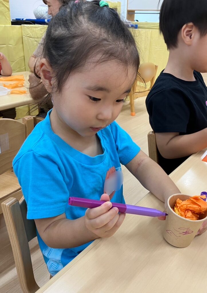 製作では、だいだい色や黄色、白のお花紙をちぎってカップに詰め、オリジナルの飲み物や食べ物を作りました。
