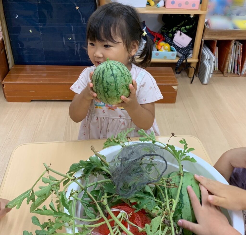 スイカが畑で採れました🍉 「スイカ食べたい✨」 スイカ好きには、丸々のスイカはたまりませんね😍 「葉っぱだー🌿」 採れたてなので、葉っぱも蔓も付いています! 「切ってみよう!」 蔓を切ろうと試みましたが、茎が太くて固... -